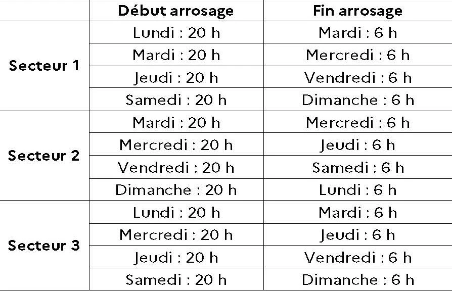 - L’arrosage par aspersion n’est autorisé que quatre jours par semaine, en respectant les tours d’eau et les horaires définis dans le tableau ci-après.